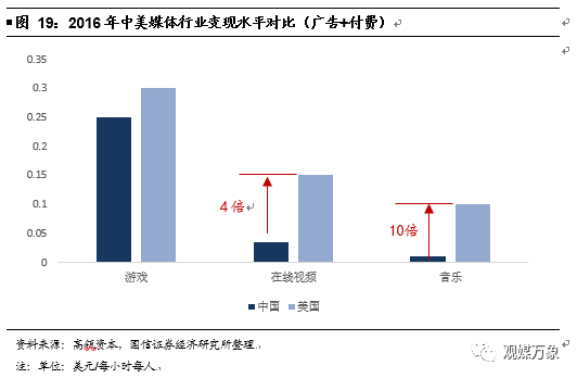 存量用户变现尚处于初级阶段。对比2016年中美媒体行业变现水平,除游戏变现水平差距较小外,在线视频、音乐等领域单位用户变化水平相差仍在4倍以上。2016年,中国居民消费支出中,娱乐类支出占比仅3%,相比于美国9%,韩国8%,中国台湾10%,日本9%仍然存在较大差距,说明虽然中国用户人数多,但是消费变现尚未到达发达水平。