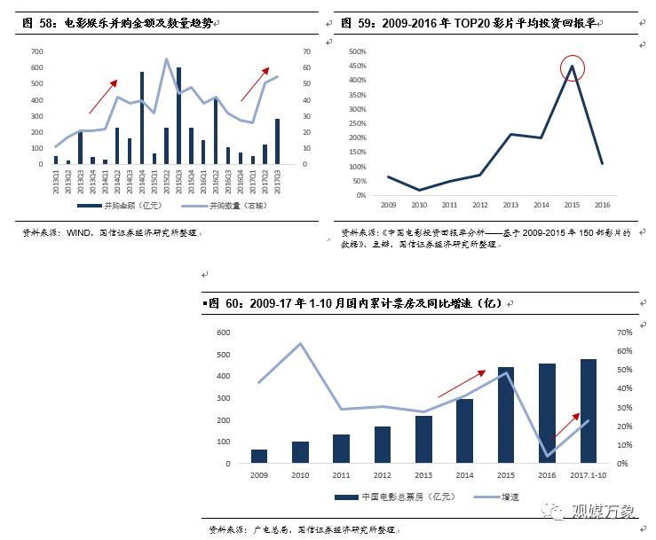 国产电影创作具备一定的周期效应:电影娱乐板块并购热度是一个“先行”指标,能够反映整体资本对市场的预期与判断;而影片投资回报率是一个“滞后”指标,反映资本投入电影市场回报情况,同时显著影响电影市场非理性投资。1)从2014-15年电影票房小高潮来看,2014Q2电影产业并购数量突增,同年电影票房增速触底回升,在经历了三年左右沉淀周期后,资本加持制片投资之下2015年票房市场出现高增速及投资回报率高增长;而在2015年影片投资回报率飙升后,则进入资本过热、“短平快”低质量影片流入市场,自然进入再一轮“冷却期”。2)从2017年电影市场来看,2017Q2电影市场并购数量同样出现突增,而从1-10月票房表现来看,2017年度票房极大概率出现增速上扬,我们认为2016年低投资回报率下制作端持续沉淀,使得劣后产能逐步出清,2017Q2资本重新进入市场有望释放优质影片制作产能,2018年票房市场大概率回暖。