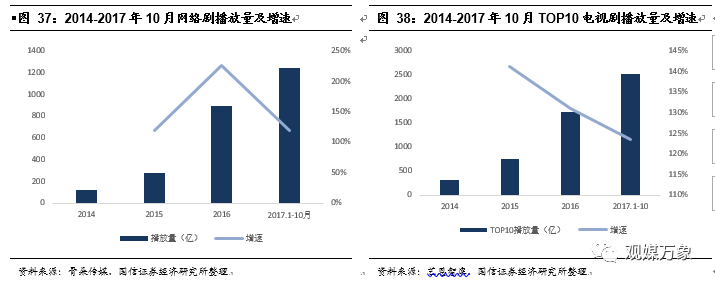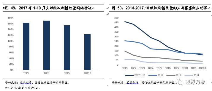 2)头部版权剧播放量屡破上限,TOP3播放量增速高达171%远超网络剧及普通版权剧。从2017年1-10月头部电视剧播放量同比增速来看,TOP3电视剧同比增速高达171%,远高于TOP10整体124%的同比增速;同时2017VS 2016,TOP6-TOP10电视剧播放量基本没有增长,播放量增量基本完全来自TOP5头部剧目。