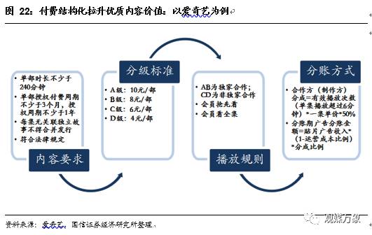 我们仅以爱奇艺现有的网络剧分账政策为例,说明付费模式下对优质内容和普通内容两极分化。A级网络剧分成标准,即10元/部、剧集15集计,总播放量10亿的“优质内容”(TOP3%网络剧播放量在10亿以上)制作方分成=10亿*(10/15)*0.5=3.33亿元;播放量1亿的“普通内容”制作方分成=10亿*(1/15)*0.5=3333万元。而在传统版权销售模式下,按照平均成本以4000万、剧集15集计,按照电视剧行业毛利率40%左右估算,通过版权售卖的方式,内容方获得收入6667万元。因此此例中,C端付费模式下,优质内容价值提升4倍,普通内容价值折半。C端付费模式下,优质内容与普通内容价值分化加剧,优质内容天花板打开、结构化受益。一方面,互联网时代口碑传播成本很低,优质内容与用户间的信息不对称消除;另一方面,C端付费相较B端广告收入,优质内容能够获得更高的价值,天花板打开。
