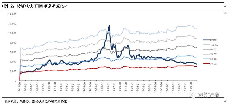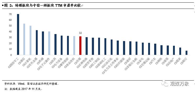 3)横向比较:与中信一级子版块的各个行业相比较,传媒板块在29个版块中位于第11位,TTM-PE显著低于TMT成长板块通信、计算机板块、电子板块,同时亦低于食品饮料板块(消费类)。