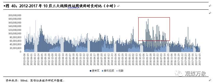 2)2015年率先推出“精品化”自制剧策略的爱奇艺在2015-16年间平台使用时长出现了显著的领先优势,但在腾讯视频和优酷发力精品剧市场后竞争优势渐平淡。2015年爱奇艺、乐视、腾讯三大平台TOP5自制剧平均播放量分别为46亿次、12亿次和2亿次,爱奇艺剧集热度遥遥领先;但在优酷、腾讯视频发力精品自制市场后,截至2017年10月爱奇艺、腾讯、优酷在播网络剧总播放量分别为21亿次、28亿次、43亿次。