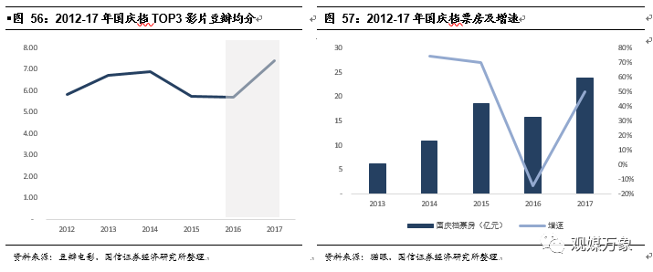 2)影片质量攀升下,观影需求能够迅速释放。以2017年国庆档为例,档期TOP3影片豆瓣均分高达7.43分,远超2016年的5.70分;近5年国庆档TOP3影片均分也仅为6.19分,档期国产影片“高口碑”拉动档期票房同比增长60%。