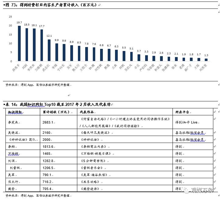 获利高、周期短,流量红利大,知识付费对内容生产者吸引力较大。对于知识付费的供给端,即内容生产者而言,知识付费平台为其提供了优质内容的发布和变现渠道。相比于传统的出版业和教育业,移动互联网时代兴起的知识付费领域参与方较少,制作周期较短,导致内容生产者的获利周期较短。此外,知识内容为生产者带来丰厚利润。截至2017年11月,得到平台的付费订阅栏目生产者平均收入高达740万元,其中5位生产者累计收入超1000万元。截至2017年2月,各平台知识网红Top10的平均收入高达1482万元。
