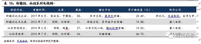 3)《魔兽》:版本迭代热度不减,用户为情怀付费精神内核强输出,赋IP新价值。《轩辕剑外传:汉之云》游戏本身即拥有非常宏大的世界观,场景众多、剧情丰富、人物关系复杂。剧版《轩辕剑之汉之云》于今年8月在东方卫视和爱奇艺开播,立足战争故事,兄弟情、儿女情与家国情重重交织,市场上流量口碑双丰收。数据显示,该剧网络播放量三天破亿,平均每集点击率超3000万以上,截至目前,在爱奇艺的播放量约为19亿,微博话题# 轩辕剑之汉之云 #阅读量也高达21.8亿。