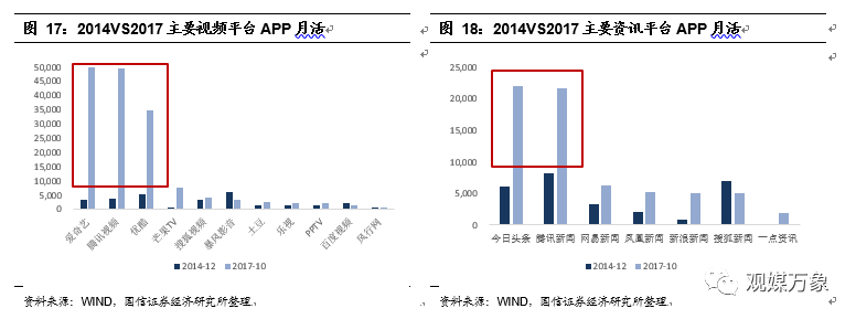 3)付费收入崛起、拓展短视频信息流广告变现,平台购剧预算未见顶。2)2015年率先推出“精品化”自制剧策略的爱奇艺在2015-16年间平台使用时长出现了显著的领先优势,但在腾讯视频和优酷发力精品剧市场后竞争优势渐平淡。2015年爱奇艺、乐视、腾讯三大平台TOP5自制剧平均播放量分别为46亿次、12亿次和2亿次,爱奇艺剧集热度遥遥领先;但在优酷、腾讯视频发力精品自制市场后,截至2017年10月爱奇艺、腾讯、优酷在播网络剧总播放量分别为21亿次、28亿次、43亿次。