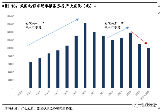 我国电影市场在2003-2010年间及2013-15年间经历了两轮景气周期,这两轮景气周期主要是渠道(影院、银幕)供给增加释放观影人口红利(2004-2010年主要是影院向一二线人口渗透、2013-15年影院向三四线人口渗透),期间单银幕票房产出不断上升。2016年以来,渠道供给释放的观影人口红利释放充分,银幕数高增长难以成为票房上扬主要驱动力,单银幕票房产出出现下降。