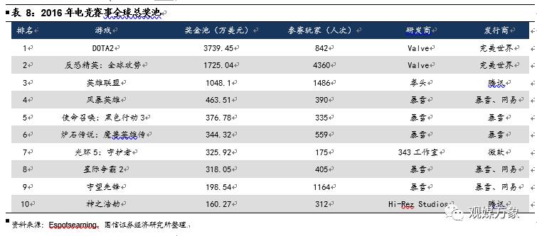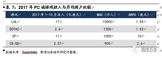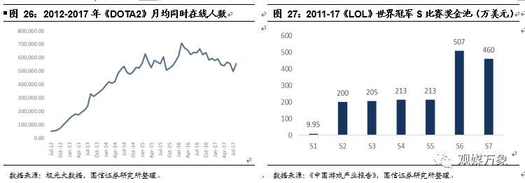 官方撑腰,高质量内容输出促进产业化变现。2017年英雄联盟全球总决赛冠军争夺战在鸟巢完美收官的新闻,出现在国家体育总局的官网上。10月28日,国际奥委会第六届峰会同意将电子竞技视为一“运动” 。赛事输出内容质量有望得到系统化提升。2017年英雄联盟联赛在北美地区来自于门票、赞助、周边、媒体、广告的总收入已达5亿美元。而电竞赛事在国内仍处于初级发展阶段,未来主客场、线下化产业的发展将更快催生产业迈入百亿甚至是千亿时代。电竞的用户数和影响范围均突破天花板。据SuperData和SteamSpy统计,《绝地逃生》、《DOTA2》和《CS:GO》两周平均活跃用户数分为690万、950万和960万人。《LOL》的MAU值在2016年即突破1亿人,连续4年成为全球玩家数最多的游戏,直到被移动端的同类型游戏《王者荣耀》超越。赛事关注度创新高。《LOL》2017年季中冠军赛事独立观看人数超过3.64亿人,最高同时在线人数430万人,《DOTA2》2017年8月结束的Ti7比赛中,最高在线人数超500万人。