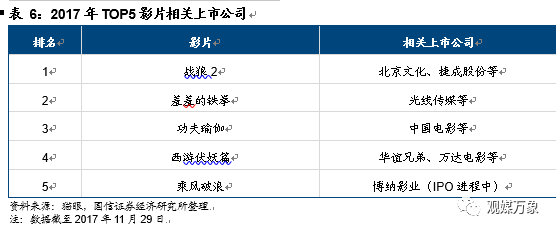 例如电影,历年票房头部影片背后均不伐A股上市公司身影,2017年TOP5国产影片A股电影公司均保持参与度。