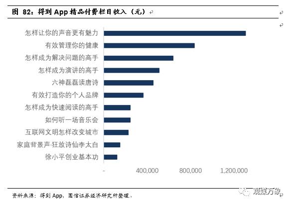 截至2017年11月,得到付费订阅栏目订阅人次达193.4万人次,累计创收3.85亿元,精品课程累计购买人次为57.39万人次,累计创收509.57万元。其中,付费订阅栏目头部效应显著,《薛兆丰的北大经济学课》及《通往财富自由》之路分别创收3946.1万元及3628.7万元,分别占栏目整体收入的10.3%及9.4%。精品课程购买人次约为付费订阅人次的1/4左右,且课程单价较低,大多数课程价格为9.9元,创收能力较弱。