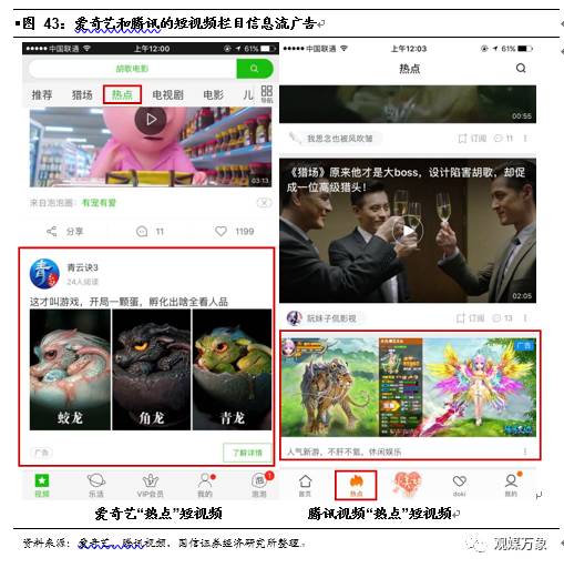 另一方面,视频网站巨头纷纷推出短视频栏目,从商业模式上来看长视频网站推出短视频栏目是对用户碎片时间的再次深耕以及粘性绑定,同时基于短视频的信息流广告成为平台收入重要补充。