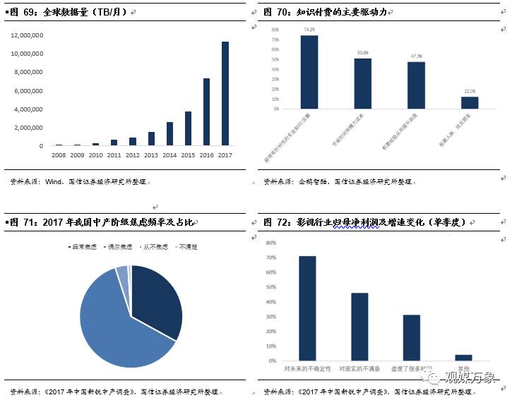 游戏:重度手游、精品化内容、IP 化运营以及向海外市场扩展,手游行业有望继续保持较高增速;影视剧:内容付费习惯养成、平台拓展信息流收入,多维收入拓展下视频平台成长迅速、购剧预算充足;竞争格局尚未确立之下,头部稀缺内容价值有望持续提升,从而带动影视剧行业持续高增长;电影:经历了2016-17年电影市场低投资回报率阶段,制作端持续沉淀,劣后产能、短平快热钱投资项目逐步出清;2017年国产影片豆瓣均分已出现触底回升、内容质量提升明显,展望2018年票房市场大概率回暖,建议关注电影内容制作发行商及院线板块;付费阅读及知识付费:打击盗版、付费习惯养成,衍生产业逐步成熟,阅读及知识付费市场已经迎来高增长。