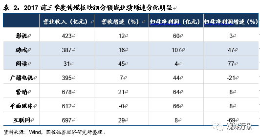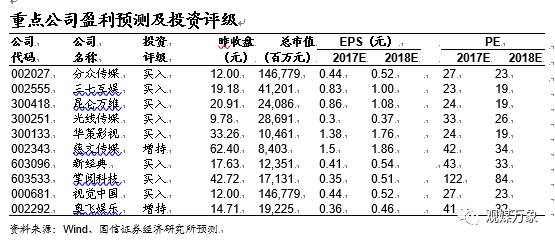 2)持续推荐细分板块成长龙头标的。我们认为短期内技术进步、政策放松所带来的人口及制度红利逐步消退,基于存量用户的深度变现成为行业成长的核心驱动要素,内部开始进入市占率提升阶段,具备优秀商业模式及竞争优势的细分行业龙头有望持续胜出;持续推荐高成长的细分行业龙头:游戏板块推荐三七互娱、昆仑万维;影视板块推荐光线传媒、华策影视、快乐购、华谊兄弟(实景娱乐)、慈文传媒,关注奥飞娱乐及院线板块;阅读及知识付费推荐新经典、掌阅科技;同时持续推荐具备资源优势的视觉中国、分众传媒。