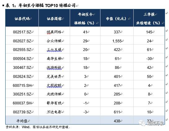 2)2017年传媒板块涨幅TOP10(截至2017年11月27日,剔除2017年次新股)标的平均市值为438亿(传媒板块平均市值仅146亿),平均业绩增速也高达32%(传媒板块整体净利润增速仅5.8%)。分众传媒、三七互娱、完美世界、光线传媒等细分龙头涨幅居前,千亿市值的分众传媒年初至11月底绝对涨幅达到29%。