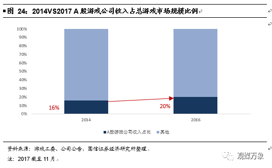 例如游戏,虽然网腾作为游戏市场上“渠道+内容”的龙头公司市场份额不断上扬,但是A股游戏制作公司总体收入规模占比依然具有优势(2014-2016年16家A股游戏公司游戏业务整体收入在行业中的市场份额由15.5%上升至20.1%),巨头吞噬的是尾部游戏公司市场份额。