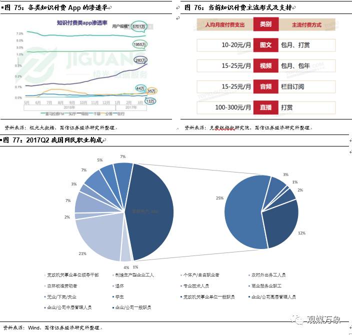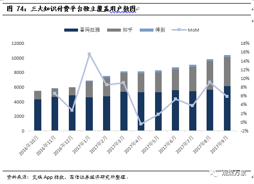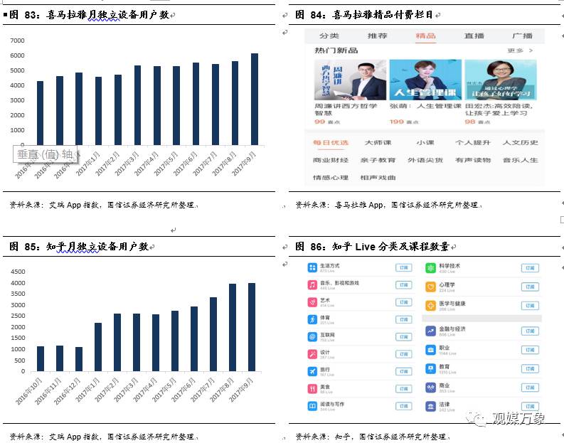 喜马拉雅、知乎等其他付费平台沉淀大规模粘性用户及优质内容,变现具空间。截至2017年9月,喜马拉雅月独立设备用户数已达6125万人,拥有马东、吴晓波、龚琳娜、华少、乐嘉等2000位知识网红和超过10000节付费课程,涵盖商业、外语、音乐、亲子、情感、有声书等16类节目;知乎的月独立设备用户数达3976万人,拥有19个热门Live分类,累计Live课程达7896次。平台沉淀的大量粘性用户及优质内容亦存在变现空间。