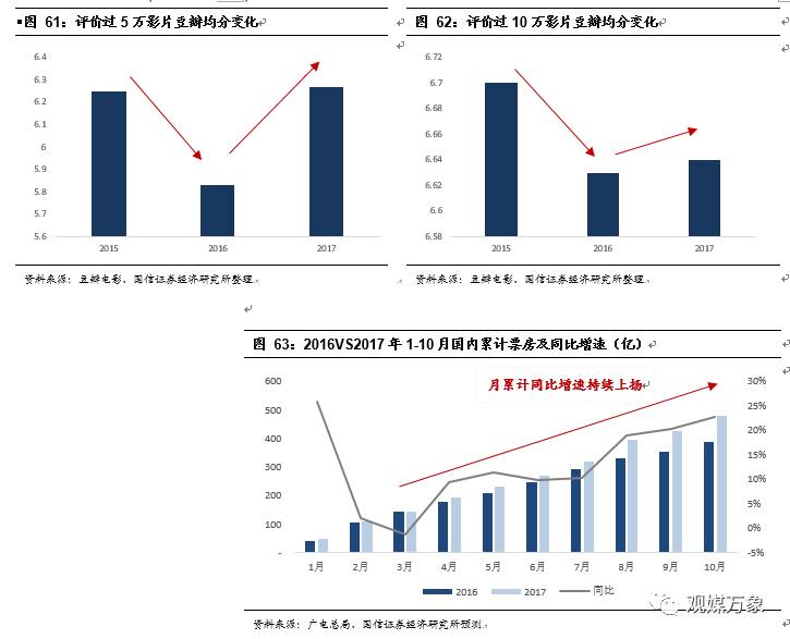 优质内容供给提升之下,2017下半年票房市场增速已呈显著回暖态势。2017年国产影片豆瓣均分触底回升:2017年评价过5万的影片豆瓣均分达6.27分,较2016年的5.83提升显著,同时超越2015年的5.25分。2017票房市场月累计票房同比增长率自3月起持续呈上升态势(1月同比高增长主要系春节时间提前影响),整个体票房市场逐步回暖。2017年1-10月票房476.2亿元,同比增长达22.7%,相比2017上半年票房10%的同比增速,票房市场基本面改观明显。