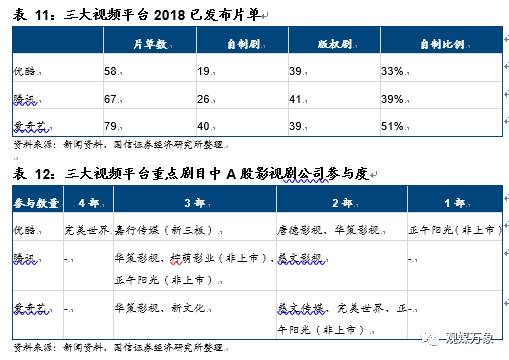 2)从近期优酷“秋集会”、腾讯视频“V视界大会”、爱奇艺“iJOY悦享会”三大视频网站重磅推出的181部影视剧(包括自制剧)来看,A股影视剧公司参与度亦很高,华策影视、完美世界、慈文传媒、唐德影视分别参与8部、6部、4部、2部和1部。