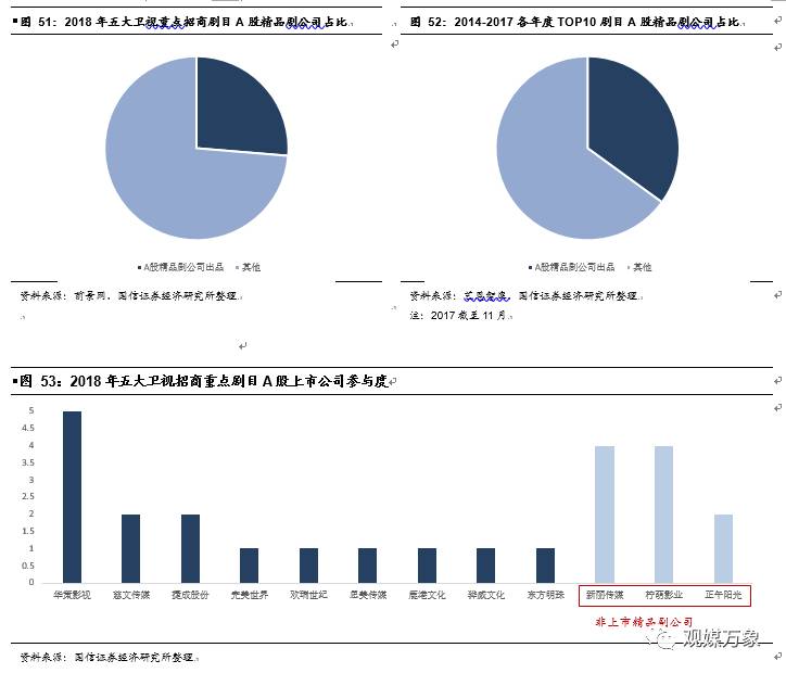 1)2018年五大卫视招商的重点剧目中,A股精品剧制作公司出品剧目占比高达26%;华策影视、慈文传媒、捷成股份、完美世界分别参与制作5部、2部、2部重点招商剧目,而欢瑞世纪、思美传媒、鹿港文化、骅威文化、东方明珠分别参与1部。