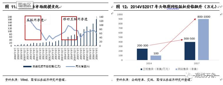 互联网渠道向文娱平台用户渗透过程中,电视剧、游戏等领域经历了第一轮次的高成长。如互联网视频渠道对传统电视渠道替代过程中,电视剧网络单季版权价格由不及卫视版权价格50%,到突破卫视价格3倍。