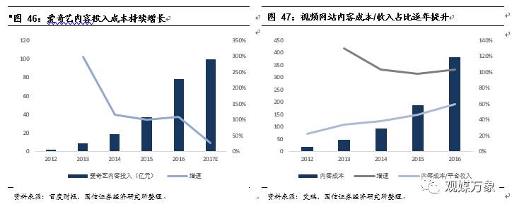 资本实力夯实下各大巨头均不断加大内容端投入,抢占优秀资源。视频网站整体内容投入成本占营收比重从2012年的22%上升至2016年的60%。具体以爱奇艺为例,2016百度年报披露内容投入成本为78.64亿元,同比增长110%,且从2010年起内容投入的同比增速始终保持在100%以上,近期爱奇艺披露其2018年内容仍将持续加大投入,将突破100亿。