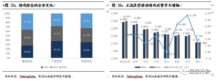新生代玩家成“鲸鱼”,重度游戏发酵深挖用户价值。TalkingData将“鲸鱼用户”定义为月付费超1000元的群体,数据显示18岁及以下的新生代玩家中“鲸鱼”比例远高于其他年龄段,电竞等重度游戏对于具备高付费意愿的年轻群体极具吸引力。截至2016年底,重度游戏占比达37.4%,较2014年增长近30%,远高于轻中度游戏。《梦幻西游》、《穿越火线》和《剑侠情缘》等重度手游陆续上线,传承PC端品质和玩法,借力竞技对战的游戏氛围,将持续从付费意愿维持高位、付费能力逐步提升的年轻玩家中挖取价值。