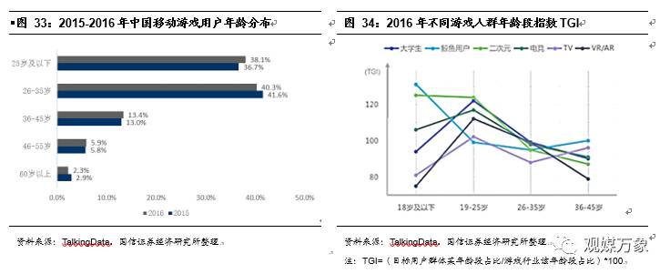 移动游戏核心用户年轻化。截至2016年底,国内移动游戏用户中,25岁及以下用户的比例达38.1%,同比增长4.1个百分点,00后与90后正在稳步成长。26-35岁用户比例为40.3%,目前仍是移动游戏第一大用户群。用户年轻化的特质将驱动游戏行业产品布局更加贴近大学生等年轻人群,不断满足其对二次元、电竞等游戏的需求,反哺用户消费。