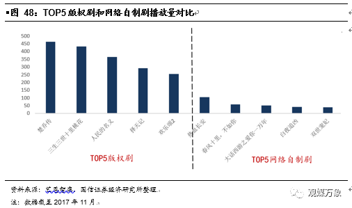 1)头部网络剧播放量仍与头部版权剧差距很大,头部版权剧对渠道的流量聚集效应难以替代。截至2017年11月,年度TOP5版权剧播放总量是TOP5网络剧播放总量的5倍,精品网络独播剧具备提升渠道粘性不可否认的作用,但是头部版权大剧对于渠道平台流量聚集依然不可或缺。