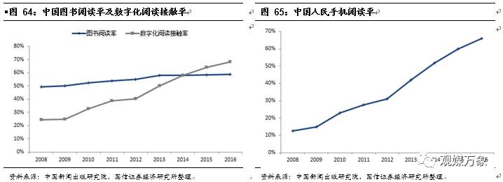 阅读率逐渐提升,阅读习惯正在养成。,2016 年我国成年国民图书阅读率为58.8%,较2015 年上升0.4%;数字化阅读方式的接触率为68.2%,较2015 年上升4.2%;55.3%的成年国民进行过网络在线阅读,较2015 年上升4.0%;66.1%的成年国民进行过手机阅读,较2015年上升6.1%。