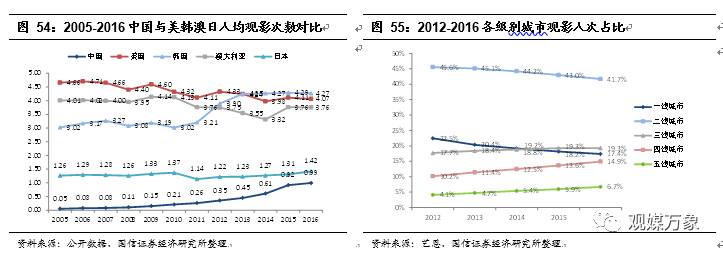 1)中国人均观影次数远不及美韩澳等发达电影市场,与日本市场接近,需求端上升空间巨大。2016年全国观影人次13.7亿,人均观影次数0.99次,创下新高,然而与全球其他发达电影市场比较明显落后,2016年美国、韩国、澳大利亚和日本的人均观影次数分别为4.07、4.27、3.76和1.42次。