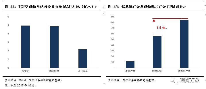 基于短视频信息流广告具备流量基础(爱奇艺、腾讯视频MAU均为今日头条2倍),同时我们测算基于信息流广告CPM是视频贴片广告的1.5倍;2016年今日头条基于不到1亿月活实现60亿信息流广告收入,基于4亿用户规模,视频网站短视频信息流广告收入有望成为贴片广告、用户付费收入外的第三大新的收入支柱,有力保障其购剧预算提升。另一方面,视频网站巨头纷纷推出短视频栏目,从商业模式上来看长视频网站推出短视频栏目是对用户碎片时间的再次深耕以及粘性绑定,同时基于短视频的信息流广告成为平台收入重要补充。