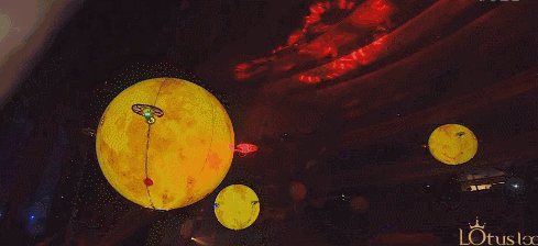 三日凌空场景中,三颗巨大的球体在观众头上转动。