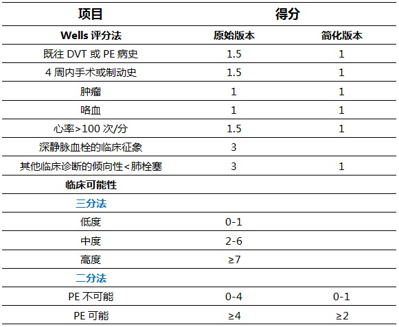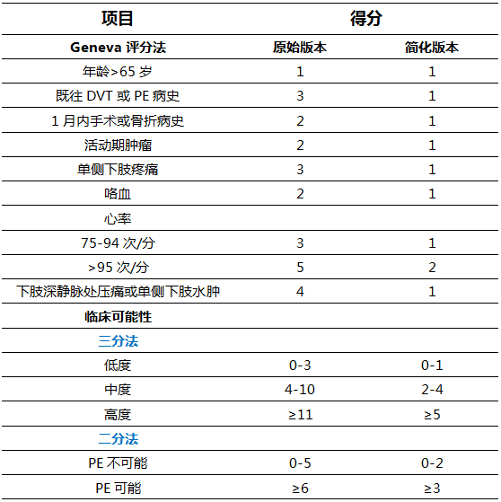Geneva评分法和Wells评分法均通过对肺栓塞的危险因素、临床症状、体征等进行综合评估,衍生出相应的评分系统,最初的版本比较复杂,对不同的危险因素、体征和临床症状等赋分的权重不同,简化版本更为贴近临床,每个条目积1或2分,方面使用。