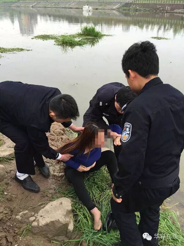 4月6日,华容县巡特警大队接到110指挥中心指令后,值班民警李中、周学军和3名巡逻队员立即赶到现场,一女士坐在城关镇沱江广场向西100米处的河边,天冷河水刺骨,女子却将双腿放入水中,随身物品散落在地上,情绪看似很低落。