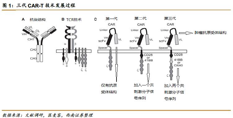 CAR技术自1989年起,经过三代演进:第一代只有T细胞刺激因子,没有共刺激因子;第二代只有单个共刺激因子;第三代才有两个共刺激因子。这些改进都是基于一系列临床试验,对CAR的有效性有显著提高。