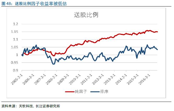 送股比例暴度到了低成长的股票上面,着有可能其排序多空组合的收益被低成长的股票(通常表现不好)掩盖。在剔除风格因子贡献后的纯因子组合中,因子收益遂体现出来。