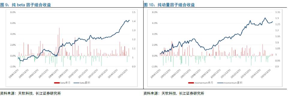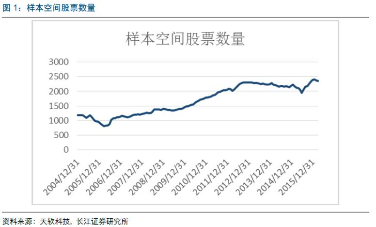 回测时间为2005 年1 月至2016 年4 月共计136 个月份,每月计算各因子对应的纯因子组合,并计算它们的收益。由于只是检测因子的有效性,而非真实可投资的组合(多空组合无法真实投资),故未考虑任何成本。样本空间为回测时间点非ST、非停牌的全部A 股。