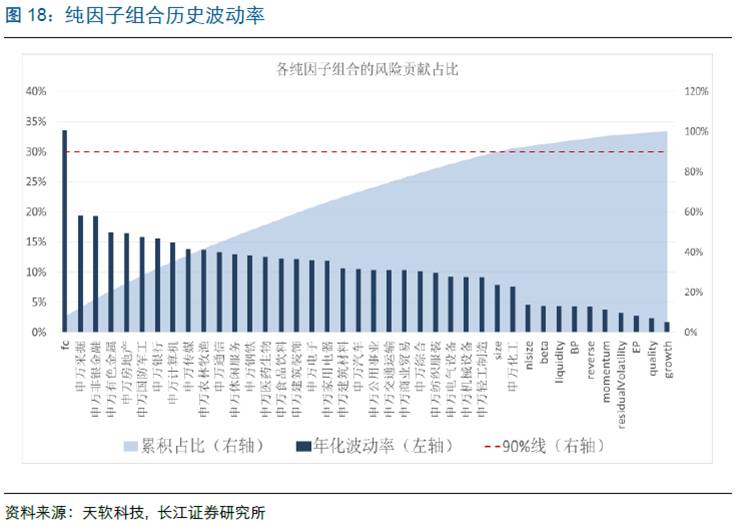 计算样本区间内各因子的年化波动率(图18),可见,截距项因子的波动率(即市场波动率)最大,成长因子的波动率最小,除规模因子外,纯风格因子组合的波动率普遍小于纯行业因子组合的波动率。市场因子、纯行业因子和规模因子贡献了大约90%的波动率,一个市场中性、行业中性的组合可以规避掉大部分风险。