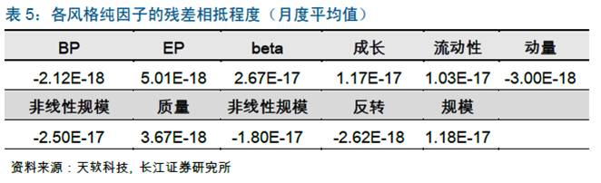 a. 检验各纯因子组合中不能被模型解释的收益是否相互抵消。对各纯因子组合,计算残差项收益Wu'*r,各月平均值见表5。