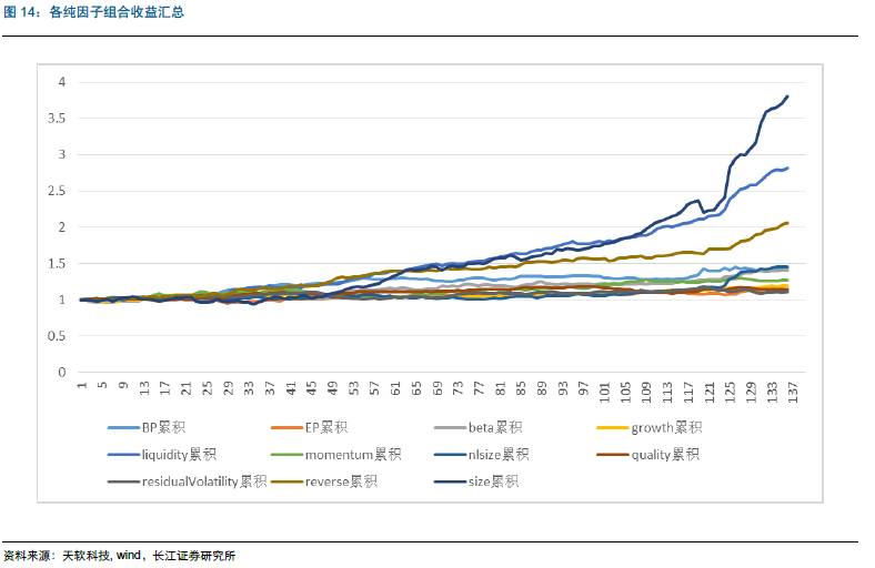 个标准差。此处展示成长、EP、BP、流动性、规模、非线性规模、beta、残差波动率、反转、动量、质量等11 个风格因子的纯因子收益。