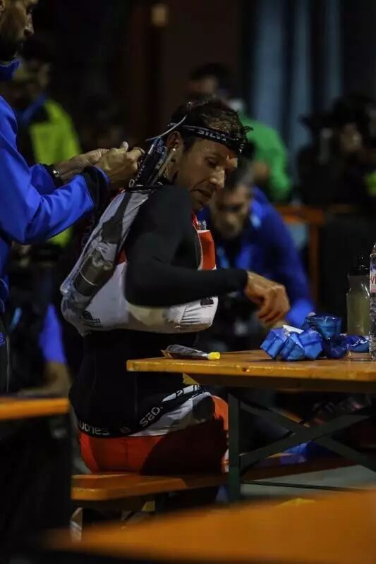 又是四分钟,美国人Jim Walmsley踩着略显滞重的步子赶来,作为本届比赛的1号选手,他的状态看着有些糟糕,脚步发沉,脸上有些无奈。这十公里的夜间下坡,不仅仅让他从之前的第一掉至第二,而且也使得他在补给站久坐不出。
