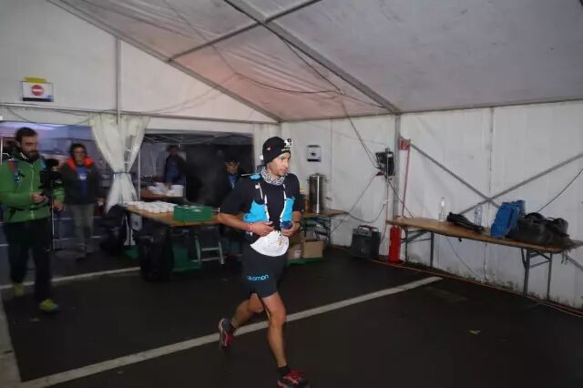 大概四分多钟后,一个大高个从山上杀出,黑色外套红白色萨洛蒙背包,手上提着杖,脖子后挂着收杖的袋子,步履轻松节奏沉稳,完全不像已经跑了110公里的样子。酒庄庄主似乎对这一段近十公里的下坡拿捏到位驾驭得当,所以进站之后不过匆匆休整就出站,只呆了仅两分钟。