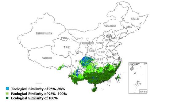 三叉苦是芸香科吴茱萸属植物, 性寒味苦。三叉苦有体外抑菌、抗氧化、解热、镇痛、抗炎的作用。三叉苦叶主治咽喉肿痛、疟疾、黄疸型肝炎、风湿骨痛、湿疹、皮炎、疮疡等。我国三叉苦资源分布广泛,在东北至西南各地均有种植。目前,国内外对三叉苦的研究多集中于植物生理、化学成分、药理及栽培繁殖技术等方面,对其产地生态适宜性区划方面的报道甚少,本文以三叉苦的主要产区为基点,运用“中药材产地适宜性分析地理信息统”(TCMGIS)分析三叉苦的全国适宜产区。结果显示广西壮族自治区、广东、海南、云南、福建、江西、湖南、贵州、浙江、台湾、香港特别行政区、重庆市、四川等省市适宜三叉苦的生长,其中面积较大的为广西壮族自治区,其次为广东省。这与历史文献记载及现代引种实践数据相吻合,应用TCMGIS技术分析三叉苦生态适宜性具有一定的科学性和准确性,对三叉苦的引种栽培及科学规划具有重要的参考价值。