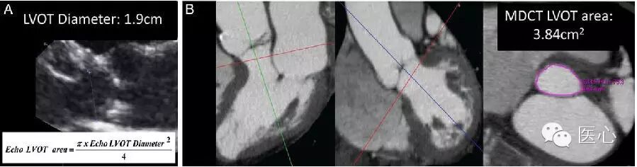 左室流出道测量值(A),经胸超声心动图测量左室流出道直径(B),MDCT测量左室流出道面积(C)(点击查看大图)