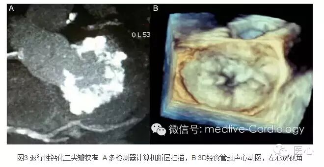 退行性二尖瓣狭窄在高龄患者中非常普遍,该病一般是由广泛的瓣环钙化引起。接合处融合的缺失(absence of commissural fusion)使得经皮二尖瓣分离术对该病无效。初步研究经验表明,若有症状患者的解剖结构合适,可考虑经导管瓣膜植入治疗。这类适应症需要综合性的成像检查及谨慎的心脏治疗团队评估(图3)。