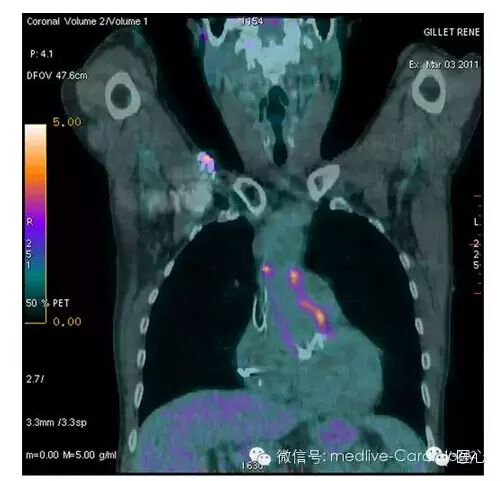 图4  18氟脱氧葡萄糖正电子成像,患者在Bentall手术后2个月出血葡萄球菌败血症,无超声心动图异常