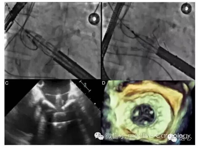 ![]() 图2 使用荧光镜检(A和B)与超声心动图(C和D)引导经导管Fortis二尖瓣假体植入