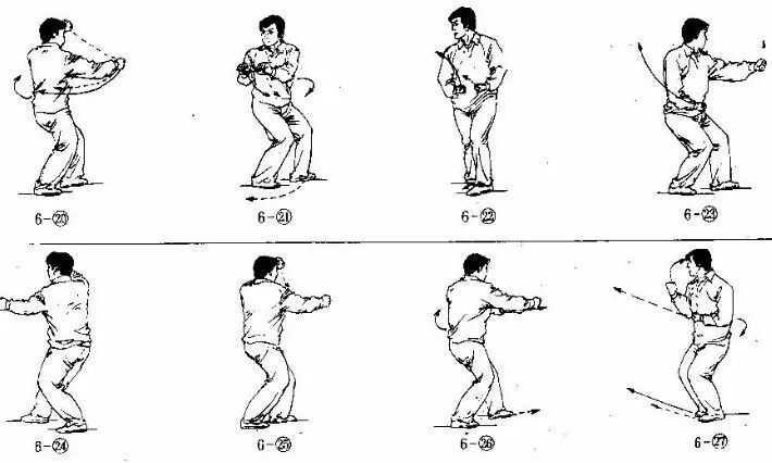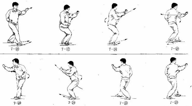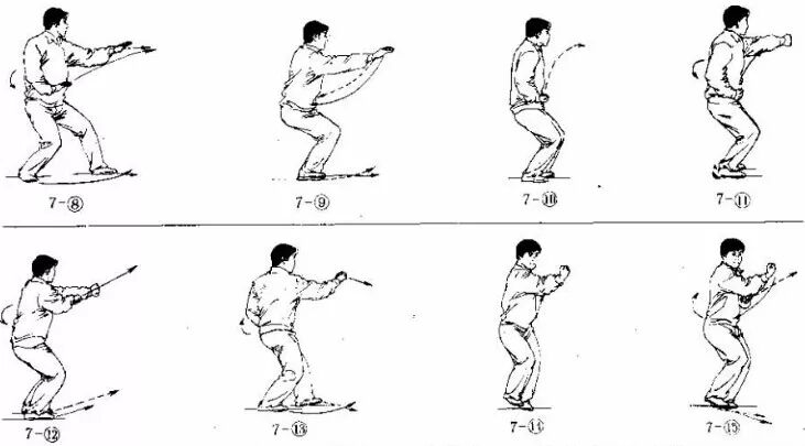 (l)预备式即原地左鹰捉式,动作及要领详见前(图7-①~⑦)略。自(图7-8)始。