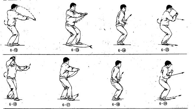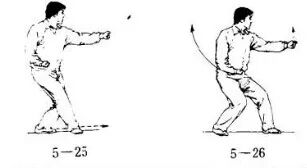 要领 两拳向右后方平摆,要用腰力,重心要稳。