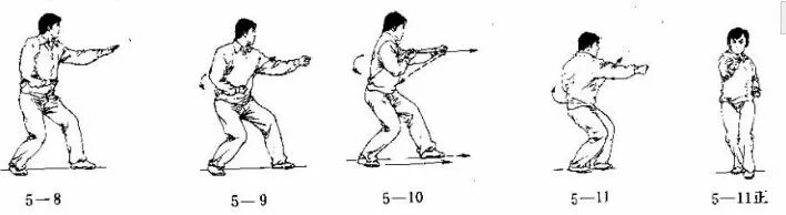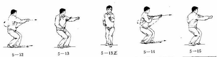 动作及要领 与(2)拗步右崩拳之②、③同(图5一14、5-15)。